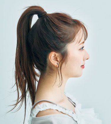 爽快な印象にしたいのでおだんごは高めに。ブラシを使って頭のてっぺんにキレイに髪を集めて、ポニーをつくる。