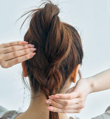 ポニーの毛束をゆるめの三つ編みにして、毛先を細ゴムで結ぶ。指先で三つ編みをほぐしてボリュームアップ。