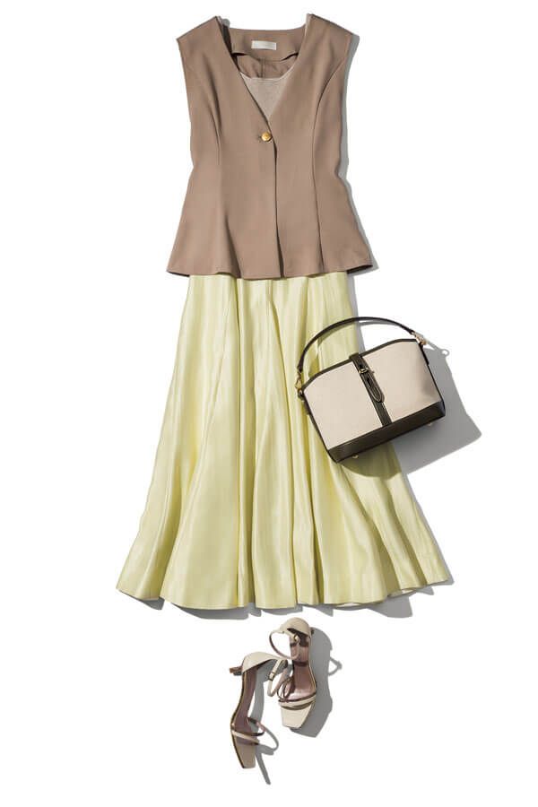 ジレはインにタンクを仕込むことで、ノースリトップス的に着こなすことも可能。さわやかなトーンのイエロースカートを合わせれば、 シーズンライクなムード漂う粋なコーデに。