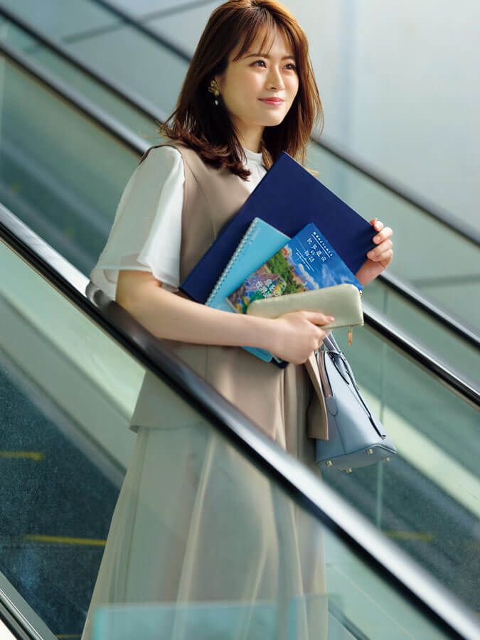 ジレ+スカートセット(ジレのみ着用)¥13,900/anySiS(オンワード樫山) シャツセット(タンクトップのみ着用)¥13,200、スカート¥25,300/ともにアプワイザー・リッシェ バッグ¥17,600/ダイアナ(ダイアナ 銀座本店) サンダル¥18,700/銀座かねまつ(銀座かねまつ6丁目本店)