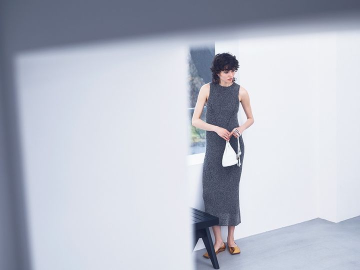暑苦しく見えないスリムな縦長シルエット。肩を出す潔さと、ニットやツイードのふっくらとした質感のコントラストを味方につけて。 グレーニットワンピース /MAISON SPECIAL(メゾンスペシャル 青山店)
