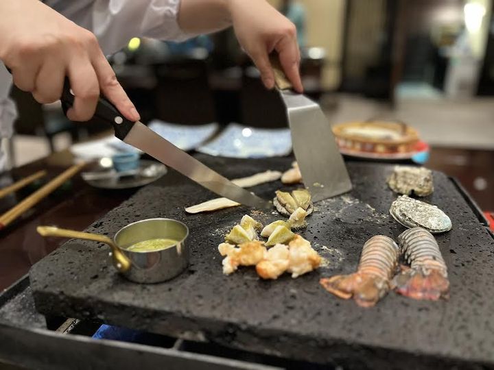 メインのひとつである活け伊勢海老は、直前に水槽より引き上げたものを捌いて、備え付けの溶岩石プレートで焼き上げるライブスタイル! 富士山から切り出したという溶岩石で焼くと、遠赤外線効果で食材がふっくらと仕上がるのだとか。