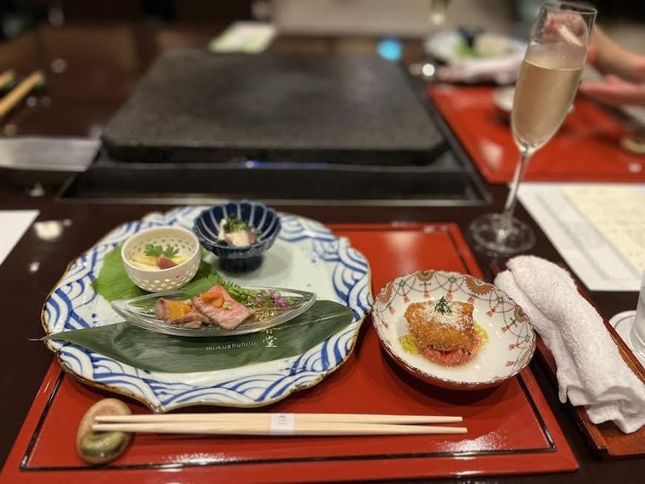 石焼会席コース(1名¥19,200 税込サ別)をいただきました。先づけの鱧にはじまり、前菜の盛り合わせと続き、国産活け伊勢海老やアワビ、黒毛和牛のロースにフィレと贅沢なラインナップ。