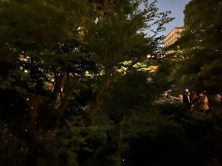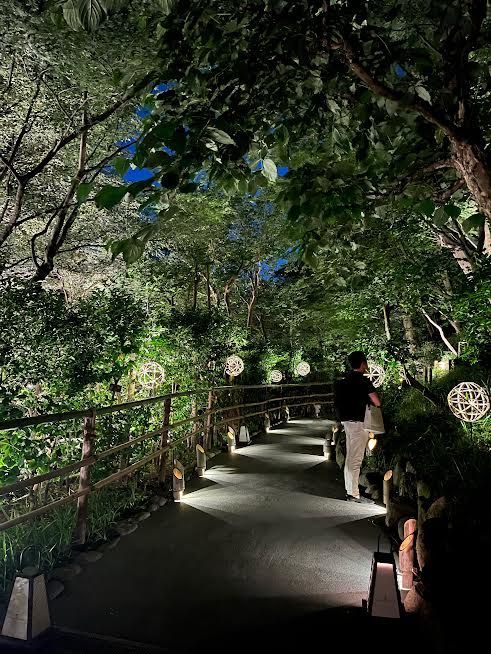 さて、お腹が満たされたあとは、お待ちかねのほたる鑑賞。すっかり日が沈みライトアップされた庭園の小路には、竹ぼんぼりと竹まりが灯り、幻想的な光景が広がっていました。