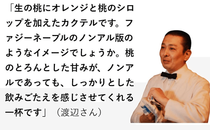 1軒目でもしっかり炭酸水を選んでいた彼へのオススメは、旬の桃を使ったノンアルコールカクテルだ。
