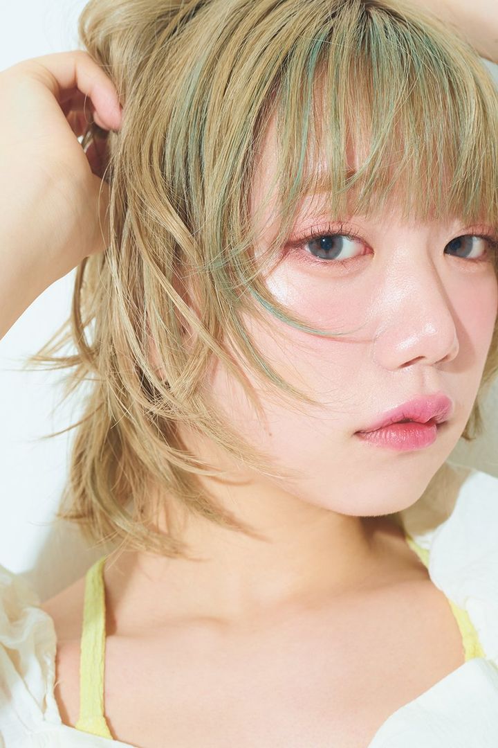 ミルクティーのようなまろやかベージュは可愛いけど、顔が膨張して見えないか心配? それなら、ベースの髪色より少し暗めの水色を顔まわりの差し色として入れれば解消! さらに、間延びしやすい頬骨付近に毛束を何本か差し込むことで、顔の中心が縮小されて求心的な印象に。小顔感がより強調される。