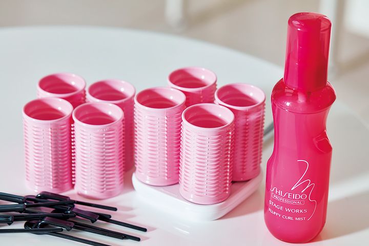 パーマはかけず、レイヤーカットにして髪全体に根元からカーラーを巻いてボリュームアップ。顔のサイドは外巻きに、その他は内巻き。前髪は1サイズ小さいマジックカーラーで。