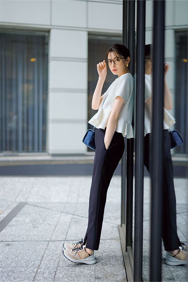 パンツ¥19,800/マイストラーダ トップス¥7,590/コ コ ディール イヤリング¥6,600 /カリーヌサルタン(ココシュニ ック新宿タカシマヤ店) 眼鏡¥ 17,600/ランバン オン ブルー (デリーゴジャパン) バッグ¥1 2,900/CHARLES & KEITH 靴¥18,920/ランバン オン ブル ー(モーダ・クレア)
