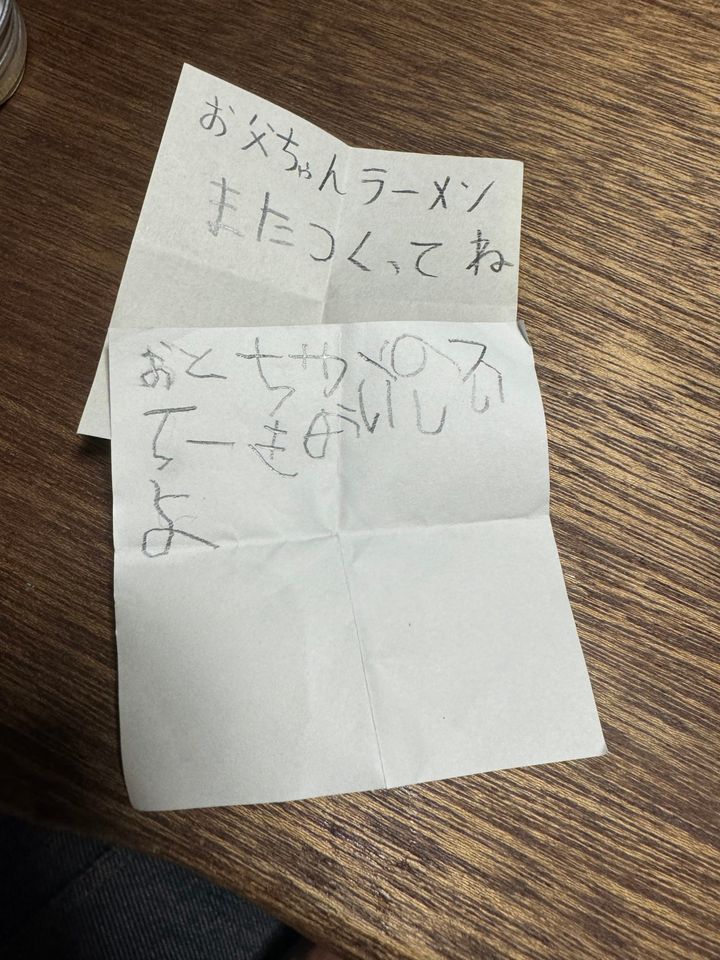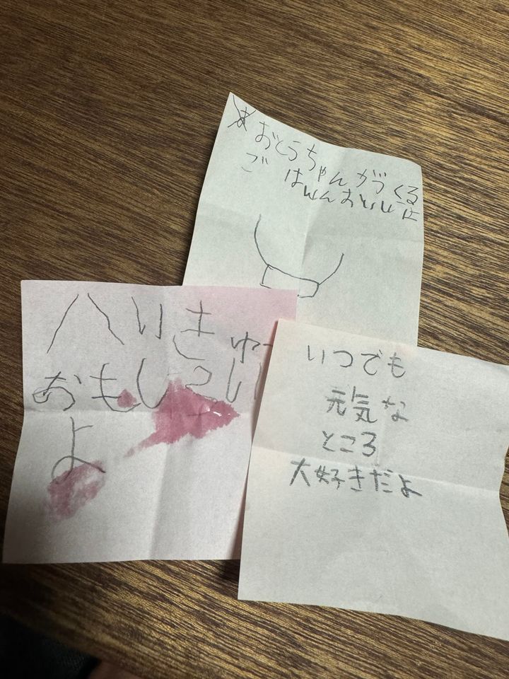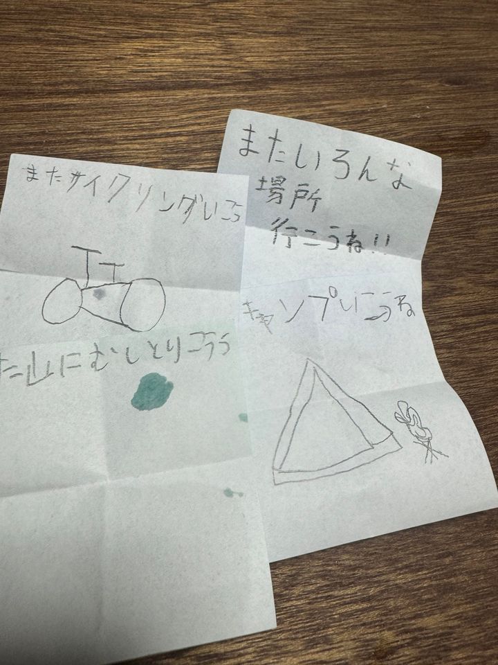 三者三様の字でいろいろ伝えてくれました。濡れているのは汗です。風呂あがりで暑くて(笑)。