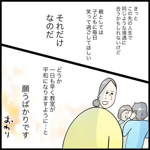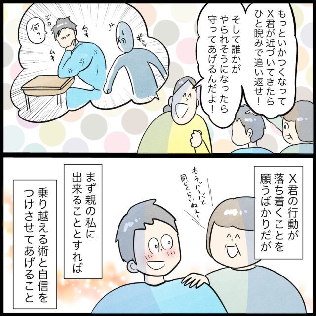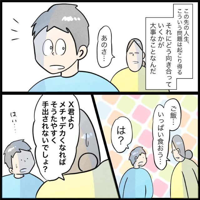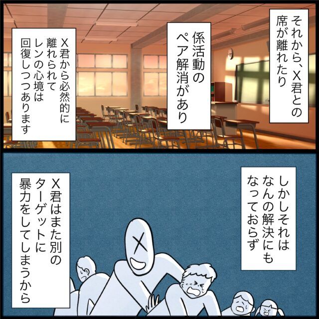 クラスメイトのXくんに暴力を振るわれ学校が怖くなってしまったレンくんのことを個人面談で先生に報告したはんままさん。先生がXくんの問題に真剣に向き合って対応してくれていることを知り少し気持ちが軽くなったはんままさんですが、先生の話から垣間見えたXくんの複雑な家庭環境に胸を痛めるのでした・・・。