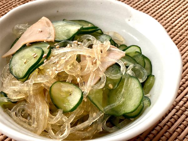 管理栄養士のともゆみです。これからの暑い季節にぴったりな料理「春雨サラダ」を、YouTube「くまの限界食堂」で作っていました。普段わが家は緑豆春雨で作るのですが、動画ではじゃがいもでんぷんで作られた春雨を使っていて、もちもちの食感になるんだそう。それにきゅうりがたっぷり入っていて、さっぱりとしておいしそう。というわけで、じゃがいもでんぷんの春雨でサラダを作ってみたいと思います。