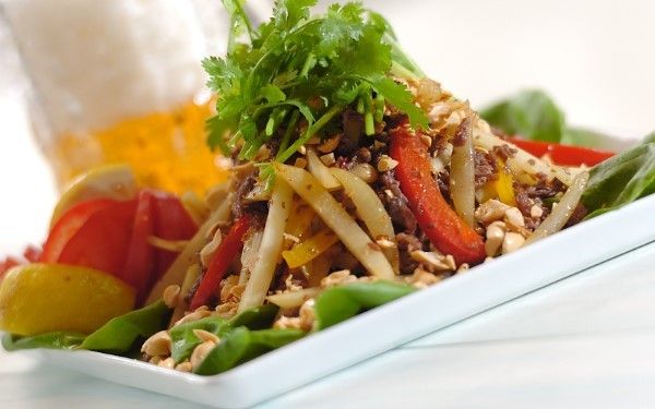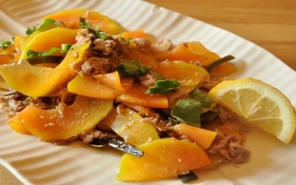 青パパイヤ、牛肉、パプリカなどをナンプラーで炒めて、タイ風にアレンジ。仕上げにパクチーやピーナッツを散らし、レモン汁をかけて召し上がれ。エスニックな風味が口の中に広がり、食欲を刺激してくれますよ。