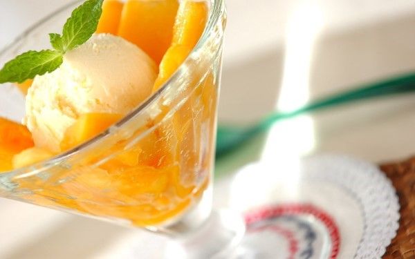 オレンジを主原料とした「ホワイトキュラソー」をパパイヤにからめることで、爽やかな風味が加わります。濃厚なバニラアイスを盛り合わせれば、贅沢デザートの完成です。