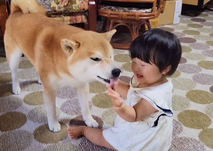 3. 泣いてる1歳児を笑顔にさせる柴犬が話題に!「あやし方も優しくて上手」「ワンちゃんセラピーは赤ちゃんにも有効ですね」