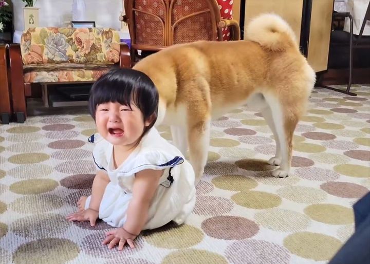 号泣する赤ちゃんに寄り添っているのは、柴犬の『こむぎ』くん。