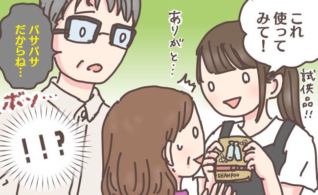 ある日、夫と長女が買い物に行って買ってきたシャンプーとコンディショナーのお試し用2種類。「使った感想を聞かせてね!」と言う娘に、早速その夜に1つ使って感想を伝えると、夫が横からまさかのひと言を……。その言葉に、悲しいながらに私のことを思って買ってきてくれたやさしさを感じ、うれしい気持ちと複雑な気持ちになったお話です。
