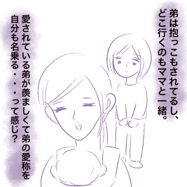 (弟は抱っこもされてるし、どこに行くのもママと一緒。愛されている弟が羨ましくて弟の愛称を自分も名乗る・・・って感じ?)