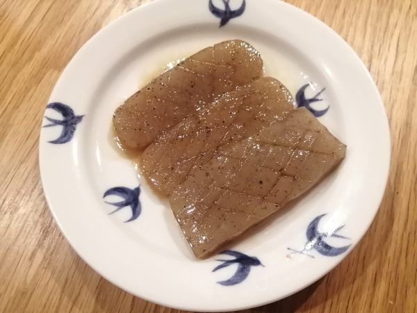 1.こんにゃくを1センチくらいの厚みに切り、格子状に切り込みを入れる