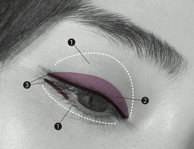 A1をアイホールと下まぶたに広げてベースにし、二重幅に2、上まぶたのキワと下目尻のキワに3を細く塗る。シャドウをシンプルにする分、アイラインはBで目尻を長めに描いて印象を強めて。Cのリップをブラシで輪郭をとりながら丁寧に塗ったら、あえてNOチークで仕上げてリップを引き立てると◎。青みのあるプラムリップが色白効果を発揮して、エッジのきいたおしゃれ顔に。