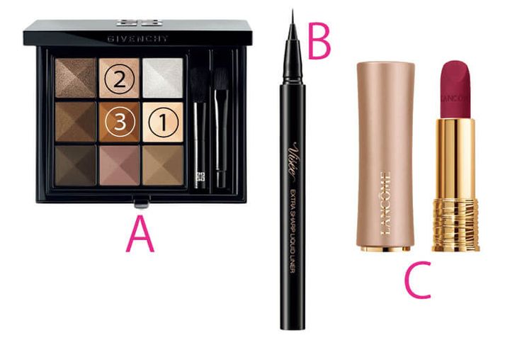 A.ジバンシイ ル・ヌフ・ジバンシイ 12 ¥8,360/パルファム ジバンシイ B.ヴィセ エクストラシャープ リキッドライナー BK001 ¥1,320(編集部調べ)/コーセー C.ランコム ラプソリュ ルージュ インティマット 440 ¥5,500/ランコム