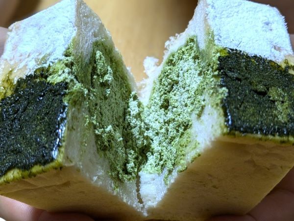 いざカット!本当にクリームがたっぷりでケーキみたいです。弾力を感じるパンを食べてみると、きめ細かな食感でフワッ。くちどけが滑らかなのですが、モチモチ感もあって食べ応えがあります。抹茶キューブは、本格的な抹茶スイーツのように濃厚な抹茶の香りと味がたまりません。生乳のみで作られた生クリームを使用しているので、ケーキ屋さんで味わうような本格派に大満足でした。
