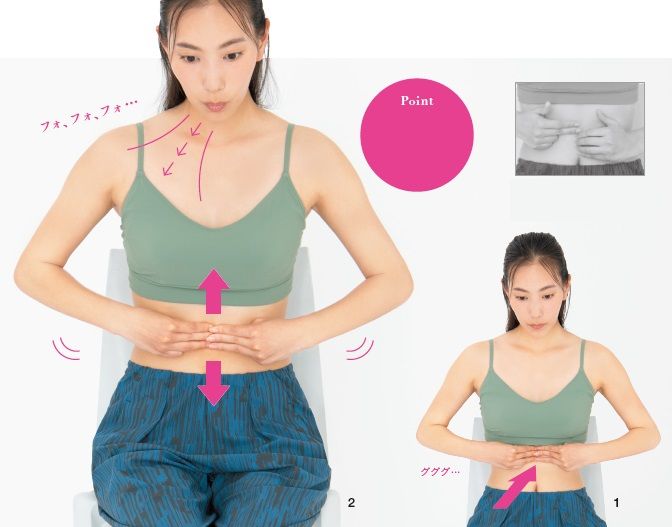 2、「フォ、フォ、フォ」と息を吐きながら、両手を上下に10回揺らす。次に、へそから上に指7本目の位置のツボも同様に刺激。神経疲労がほどけ、お腹全体が奥までほぐれる。