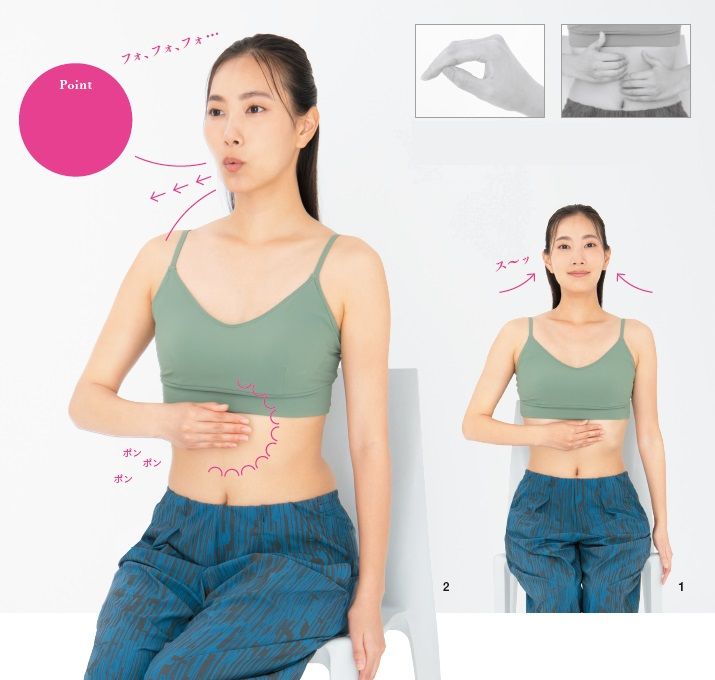 2、「フォ、フォ、フォ」と言いながら、「フォ」のタイミングで息を小刻みに吐き、同時におわんの内側の空気をお腹に当てるように、手で「ポン、ポン」と20回叩く。これで横隔膜と腹筋全体が緩み始め、自律神経もリラックスする。