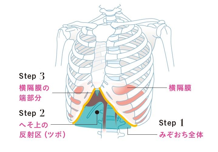 Step1でお腹を叩いて神経と筋肉をリラックスさせ、Step2でみぞおちにあるツボを刺激。Step3で横隔膜を直接緩める。