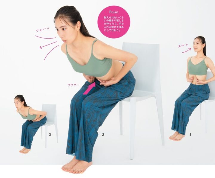 3、お腹と太ももで手を挟むようにして、ギリギリの深さまで肋骨の下に差し込む。そのままの姿勢で息を吐き切る。指を押し込むことで血流が良くなり、横隔膜がさらに柔らかくなる。