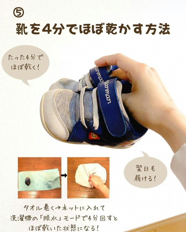 洗ったものが乾きにくい季節や、急ぎで乾かしたい時に使えるハックがこちら。洗った靴にタオルを巻いて、洗濯ネットへ入れ、洗濯機の「脱水」を4分ほどするとほぼ乾いた状態になるそうです。