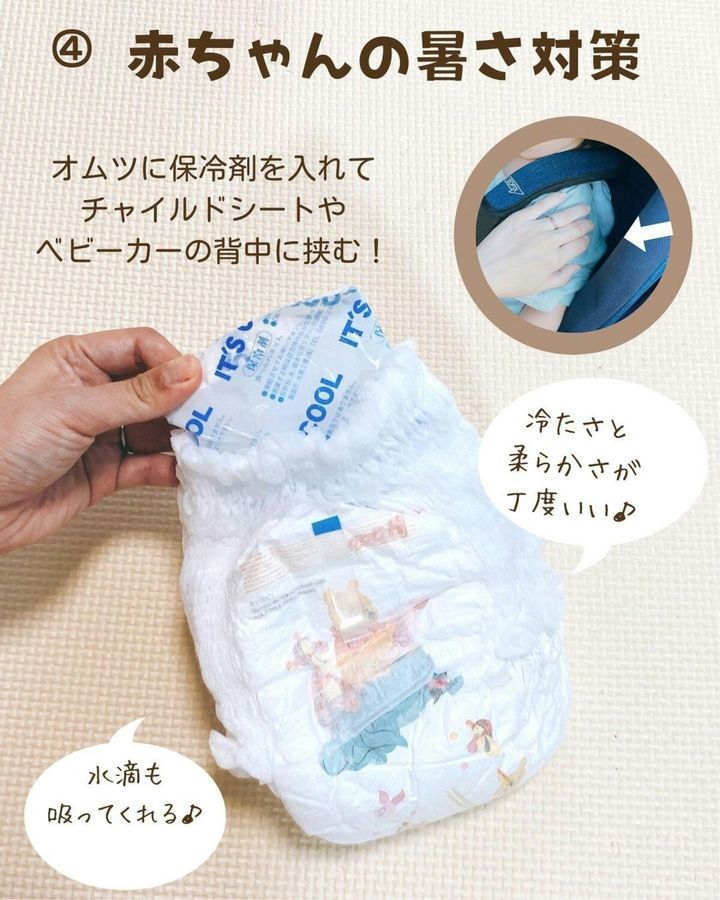 おむつの中に保冷剤を入れてベビーカーの背中やチャイルドシートに挟めば、即席の暑さ対策グッズが作れます。おむつは柔らかいので保冷剤のかたさが緩和され、また水滴を吸ってくれるので周りも濡れないからとっても便利です。