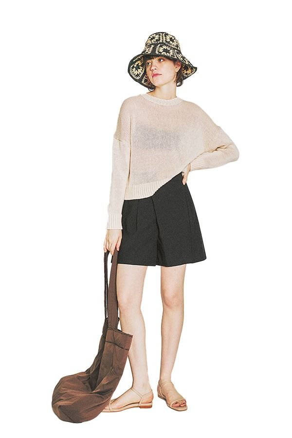 軽快な短丈パンツにルーズなニットでボリュームを補塡。すき間からのぞく肌のおかげで、長袖でも重たく見えない。肌感の多さが浮かないように、ユニークなハットやビッグサイズのバッグでそれとなくカバー。