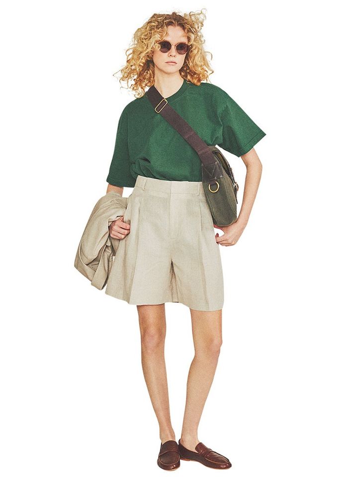 合わせたTシャツは濃厚なグリーンでハーフパンツに知性もプラス。肩掛けしたカーキのバッグや紳士っぽいブラウンローファーなど、小物も含めてクラシックなアイテムを選び、涼し気な装いを品のいいカジュアルに仕上げて。
