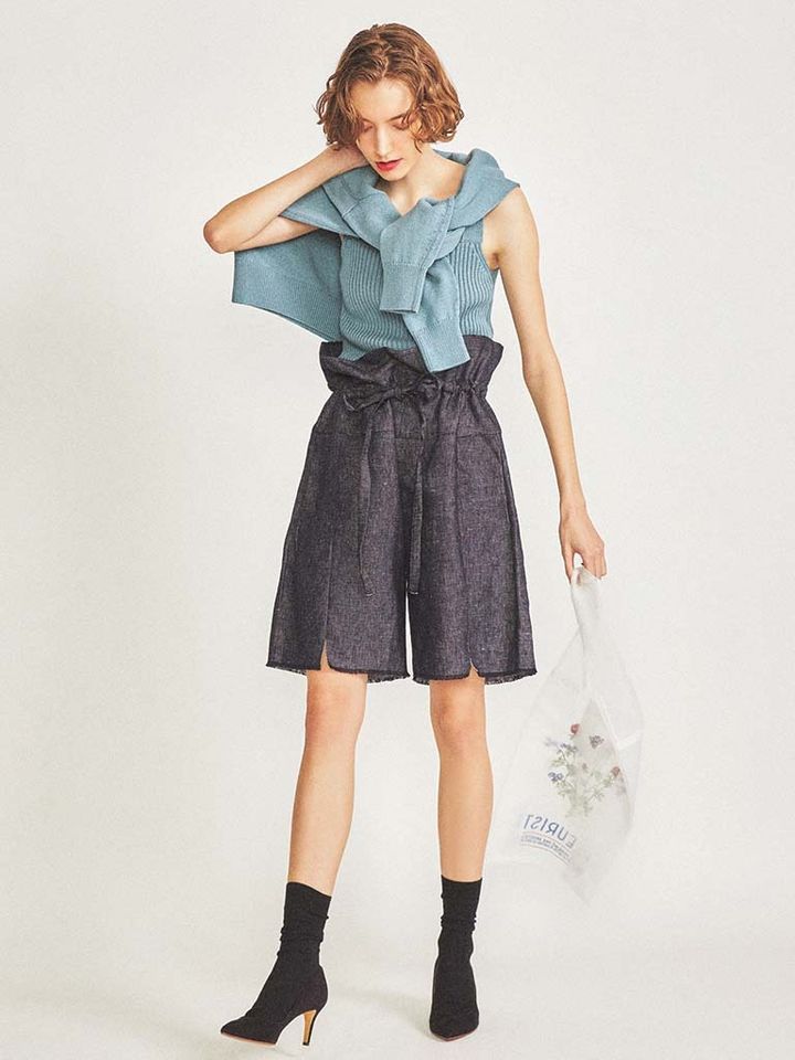 腰位置が高く見えるハイウエスト仕様に加え、広がるように上に伸びるギャザーのおかげで上半身が細く見える効果も。ひざ上丈の幅広シルエットがひざから下の脚を長く見せ、穿くだけでスタイル全体がよく見える優れもの。