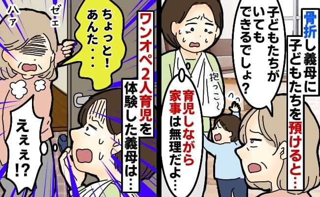 骨折中に子ども達を義母に預けると「1人でできるでしょ」と嫌み⇒ワンオペ2人育児を経験した義母は…