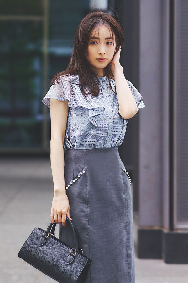 直線的な幾何学レースが大人っぽくて素敵♡ グレーのペンシルスカートとの寒色トーンでクールビューティーに。バッグは黒でコーデを引き締めて。