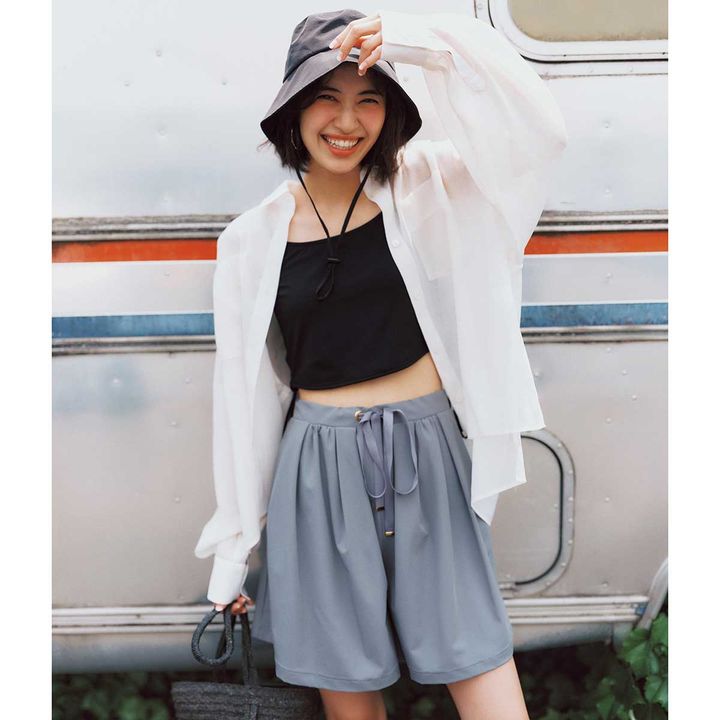 ショートパンツ¥11,000(スリースクエア)ブラトップ¥11,000(レイール/Ai)シャツ¥19,800(カデュネ)帽子¥6,050(ノーク)ピアス¥8,800(アビステ)バッグ¥19,250(メイドインマダ/ジャック・オブ・オール・トレーズプレスルーム)