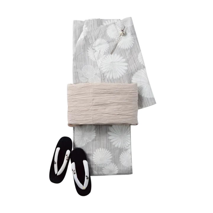 ベージュ花柄浴衣と帯、下駄のセット(腰ひも、着付けマニュアルつき)13,990円/Dita かんざし 参考商品/ふりふ(ふりふ新宿店)