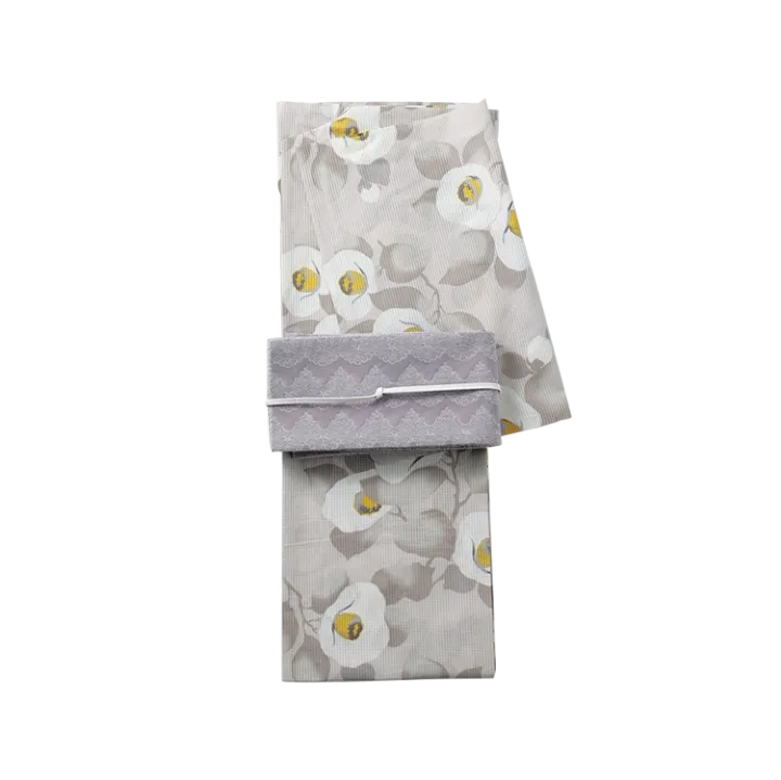 ベージュ椿柄浴衣 42,900円/芸艸堂(和風館ICHI) グレージュ華レース半巾帯 25,300円/三松 白三分ひも 10,890円/きものやまと(やまと)