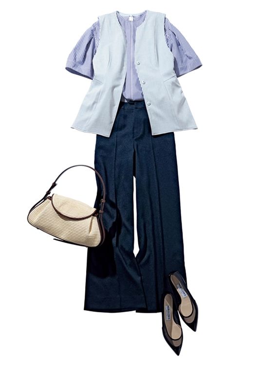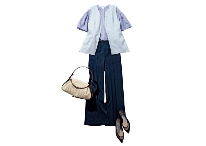 パンツ¥14,960/インディヴィ(ワールド) ストライプブラウス¥10,450/ミラ オーウェン ルミネ新宿2店 リバーシブルジレ¥25,300/ジャスグリッティー ハンドバッグ¥16,500/ル・ベルニ(キャセリーニ) パンプス¥63,800/ネブローニ