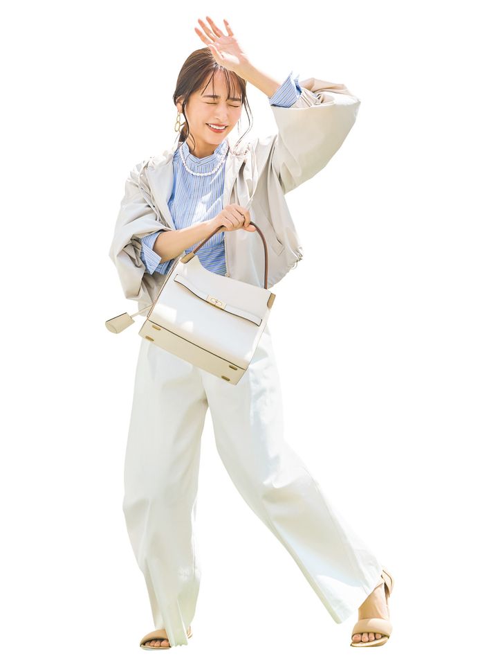 撥水、防汚機能付きの白パンツがあれば、雨の日でもこんな上品コーデで出かけられます。汚れも簡単に取れて水跳ねしても焦り不要。日常使いしたい白パンツです。パンツはロペピクニック、ブルゾンはノーク、シャツはマカフィー、バッグはトリー バーチ、サンダルはシーセイのもの。