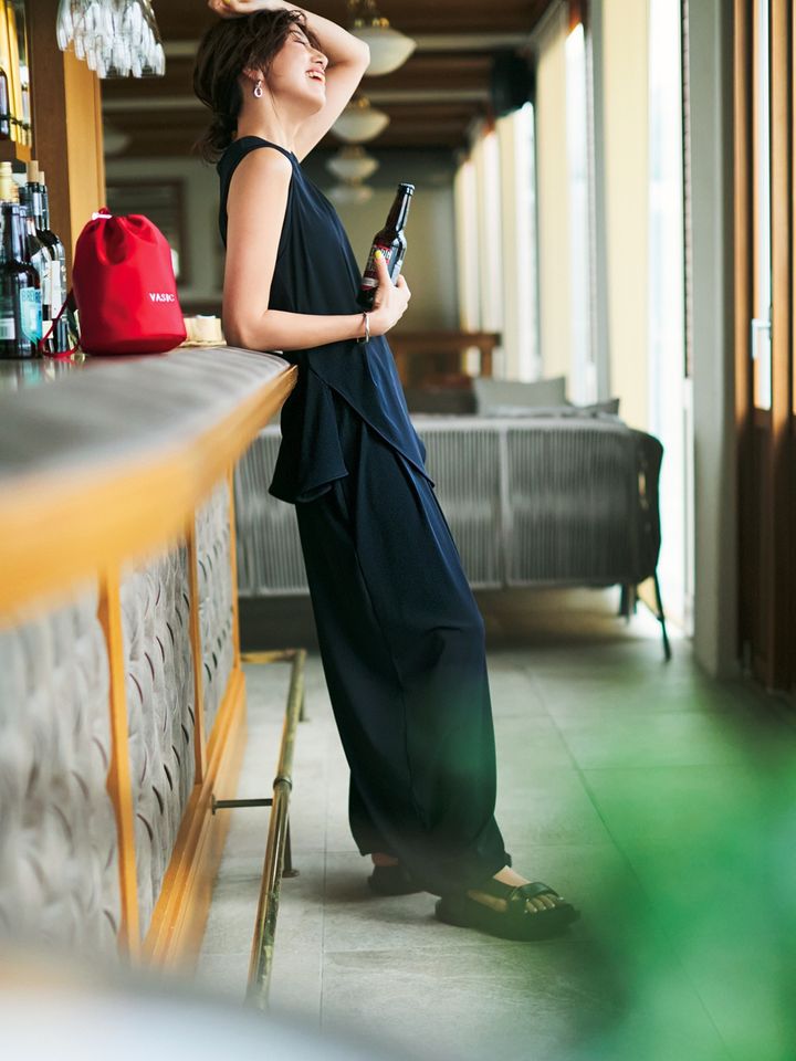 水着素材のセットアップでゲリラ豪雨も余裕。ゆるっと楽ちんに着られるのに、モードなバルーンシルエットでシックに。ホテルランチやショッピングにも行ける撥水セットアップです。パンツとトップスはナゴンスタンス、サンダルはサクラのもの。