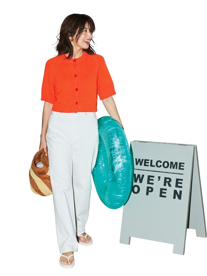 夏のワンツーコーデに白デニムが活躍。カーディガンをトップスとして着ることで、ただのカジュアルで終わらない凝ったオシャレに。撥水&防汚機能付きの白デニムは、雨の日や水遊びだけでなく、子連れの外食の時も便利です。パンツはヤヌーク、カーディガンはコルデラ、バッグはカタルツィ 1910、サンダルはスリーパーズのもの。