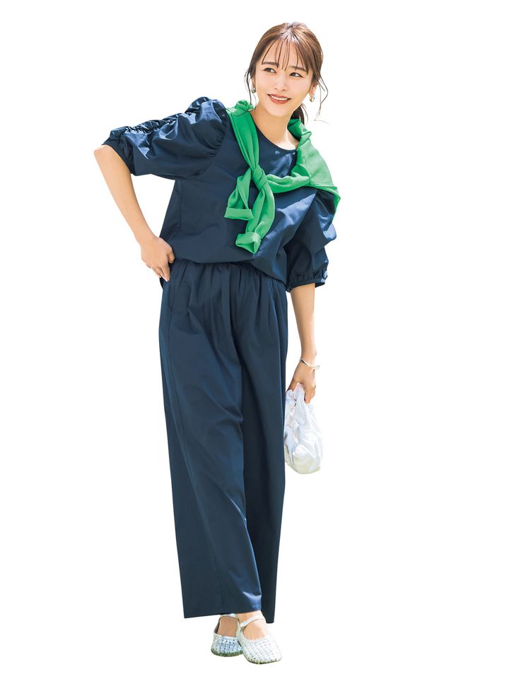 仕事や園行事に安心のネイビーセットアップ。UV機能も付いていて、帰り道の公園や水遊びにも活躍しそうです。トップスの甘デザインは甘派ママに安心感◎。パンツとブラウスはグリーンレーベル リラクシング、バッグはパピルス、靴はギャルリー・ヴィーのもの。
