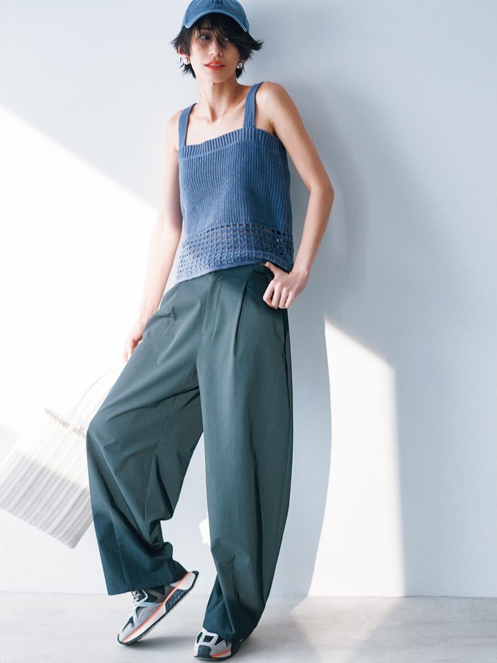 速乾素材のゆるパンツなら急な水遊びも笑顔で対応してあげられそう。キャップにスニーカーのカジュアルも、キャミニットを合われば上品に仕上がります。パンツはアルページュストーリー、トップスはゼロ バイ ワンズ、バッグはパロローサ、スニーカーはパラディウムのもの。