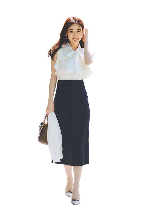 フリンジ付きのビッグリボンやフリル袖が女性らしい真っ白ブラウスを、フレアスカートではなくミニマルな細身スカートでクールダウン。