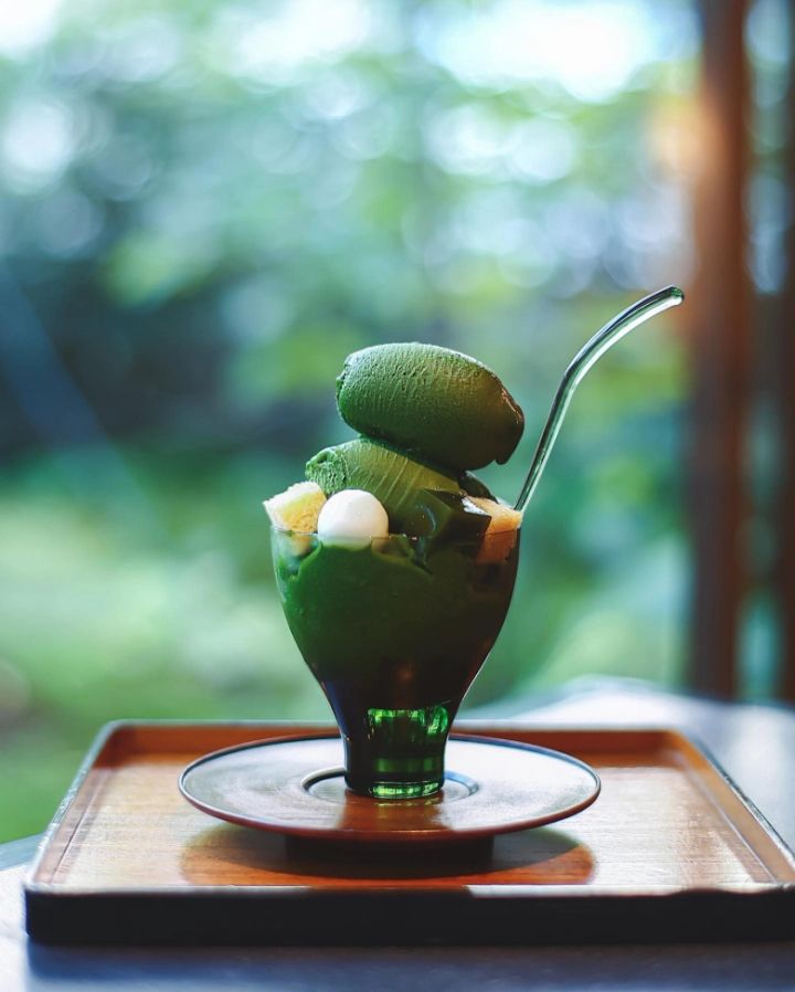 「ミシュランガイド京都・大阪2023」で、ビブグルマンとして評価されている名店。濃い抹茶を使ったパフェは濃厚で、一口食べれば抹茶の香りが口いっぱいに広がるでしょう。グラスもグリーンで、食器までこだわりがあることが伝わります。