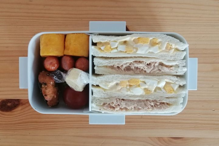 基本のおかず+ご飯を詰めるだけなら15分ほどで弁当が完成します。もし私が弁当づくりの主担当者ならば毎日このパターンを繰り返すと思いますが、夫は子どもたちのリクエストに応えてサンドイッチやおにぎりなどもつくっていました。夫が弁当づくりの担当で、一番喜んでいるのは私よりも子どもたちかもしれません。