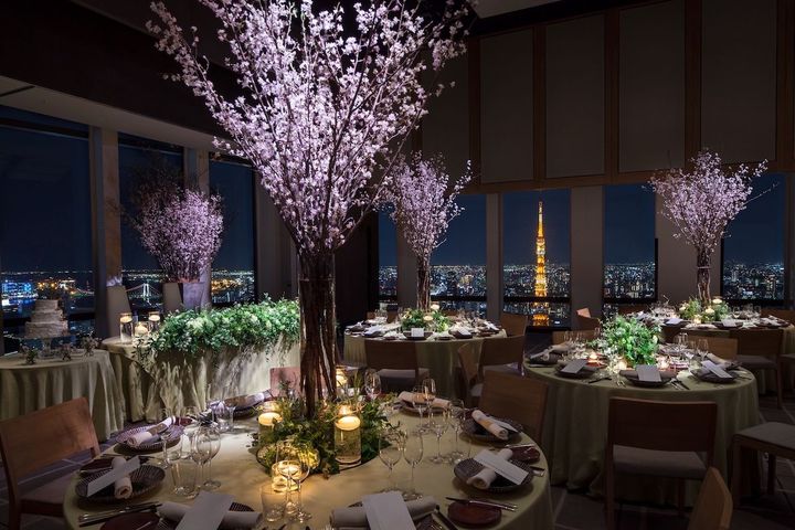 メインテーブルのサイドやゲストテーブルに桜をたっぷりと飾って。夕刻からのナイト・ウエディングなら、ライトアップして窓の外の夜景とともに楽しめます。