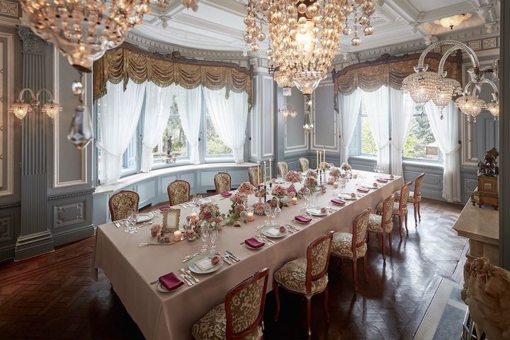 長楽館のレストラン「ル シェーヌ」は、歴史を感じさせる調度品が贅沢にしつらえられています。シックなピンクの濃淡でクロスからナプキン、装花までをワントーンでまとめ、エレガントな雰囲気に。